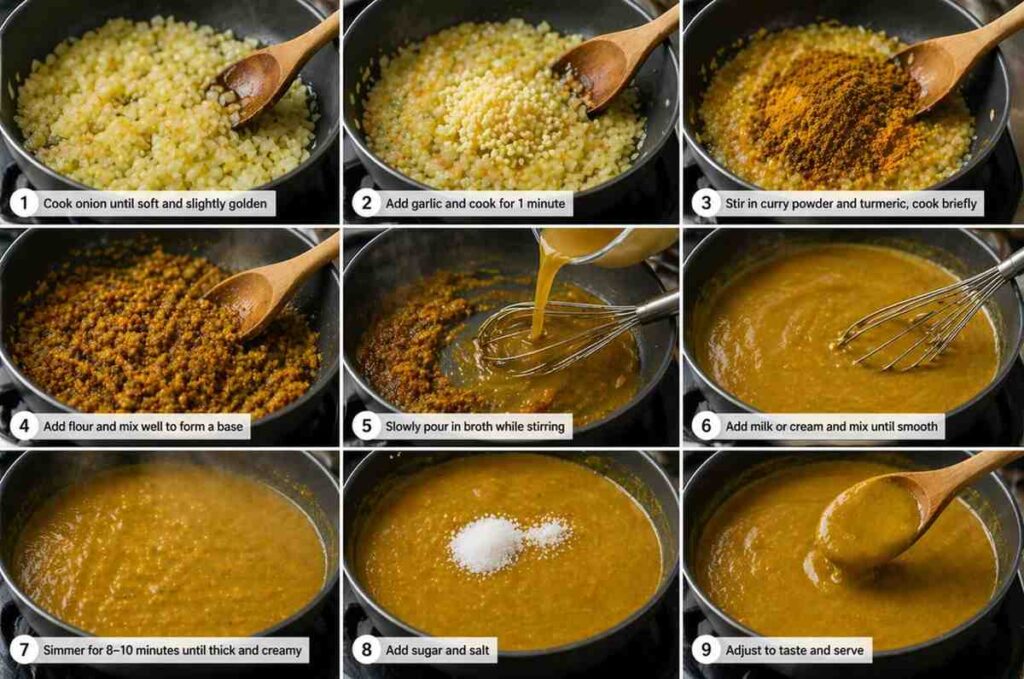 - It is made with curry powder, onion, garlic, broth, and a creamy base like milk or cream.